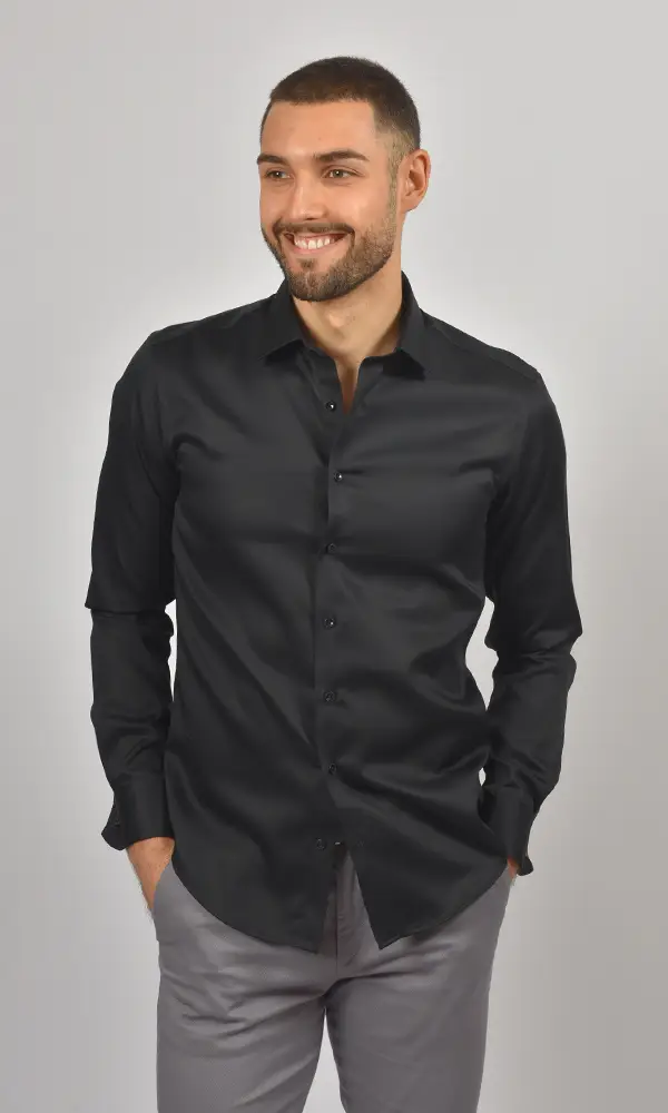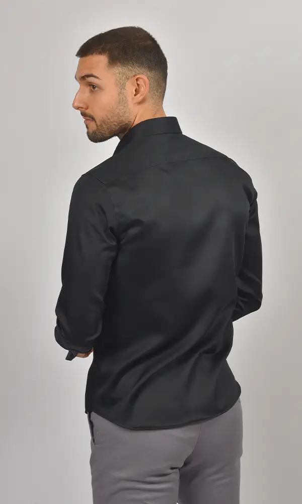Ova Satenska Crna Košulja sa Duplim Manžetnama iz kolekcije ATRIUM FASHION je vrhunac luksuzne večernje elegancije. Duboka crna boja, bogati satenski sjaj i manžetne za dugmad čine je obaveznim izborom za svečane večernje događaje, gala prilike i izlaske gde želite da ostavite snažan utisak.