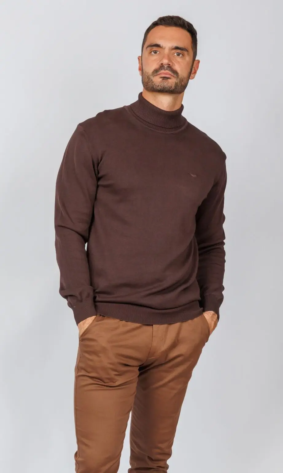 Muški džemper sa rol kragnom u toploj čokoladno braon boji. Izrađen od fine pletenine, sa diskretnim logotipom. Savršen za dodavanje zemljane nijanse i topline zimskim kombinacijama, u skladu sa klasičnim stilom Atrium Fashion.
