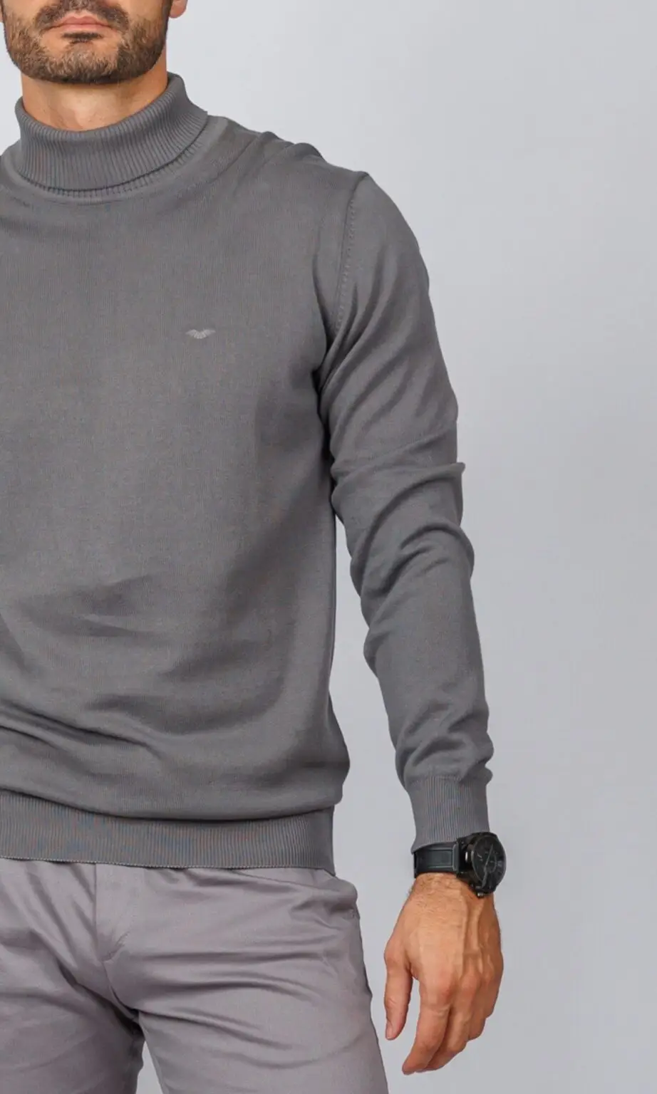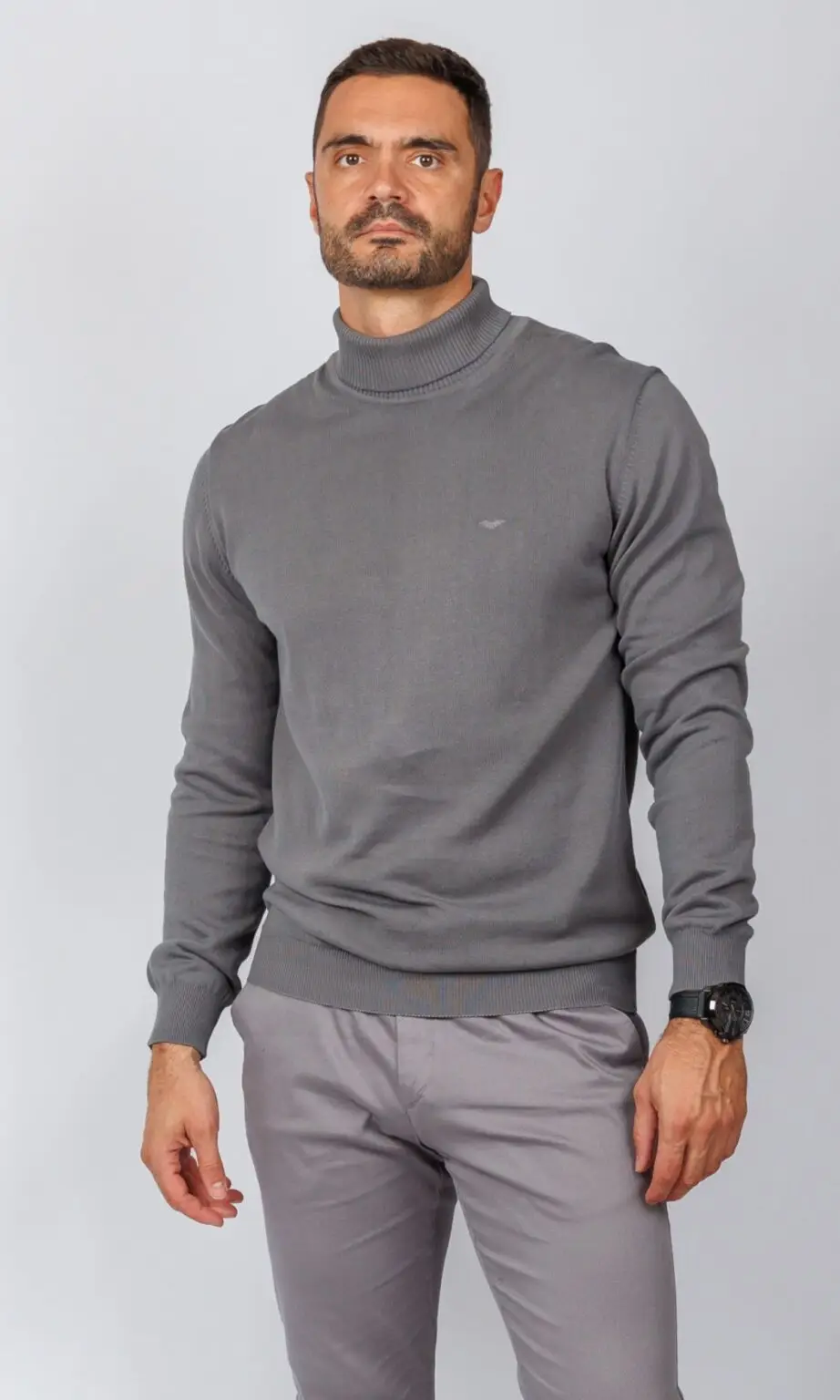 Muški džemper sa rol kragnom u elegantnoj srednje sivoj boji. Izrađen od fine pletenine sa suptilnim logotipom, ovaj klasični komad je neizostavan za zimske dane i savršeno se uklapa u prefinjenu Atrium Fashion ponudu.