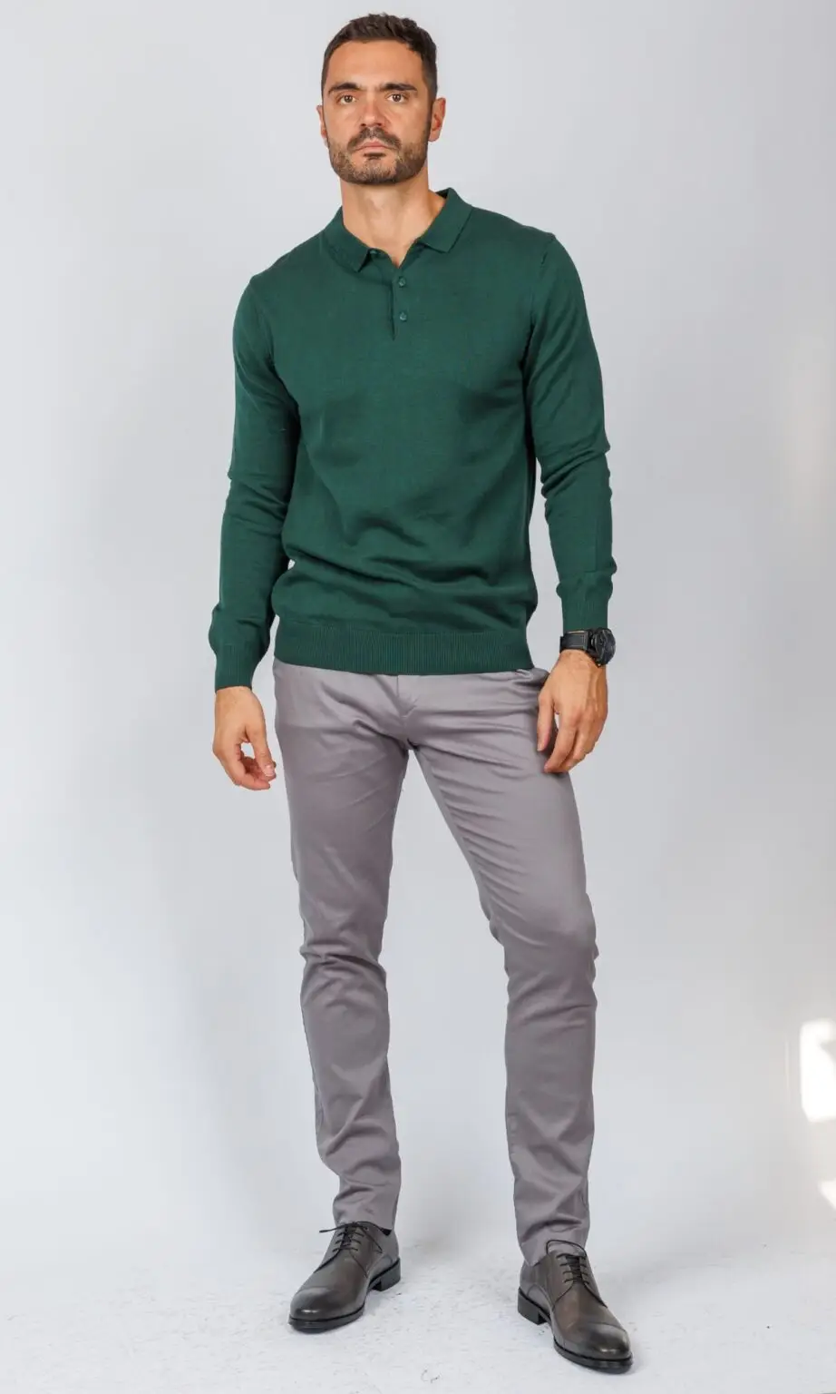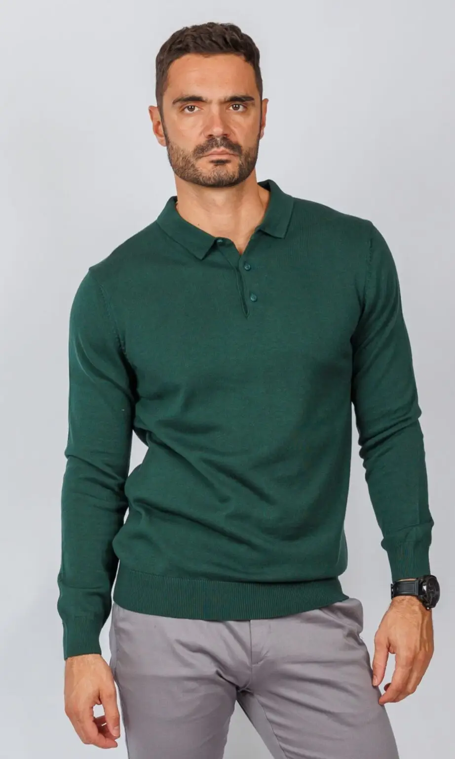 Muška pletena polo majica dugih rukava u bogatoj tamno zelenoj (smaragdnoj) boji. Poseduje klasičnu kragnu i kopčanje na dugmiće. Idealan komad za dodavanje boje i teksture u "smart casual" kombinacije, deo elegantne Atrium Fashion ponude.