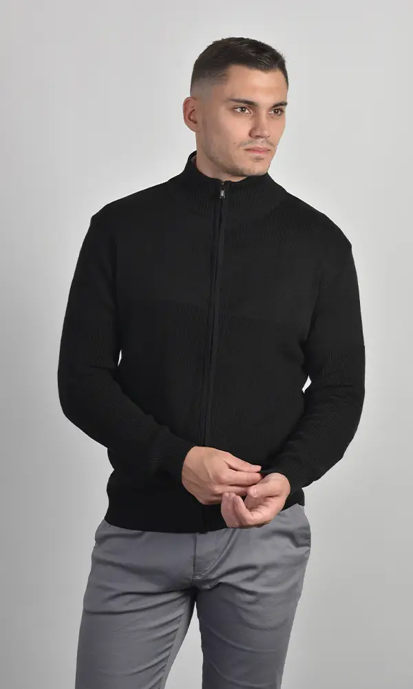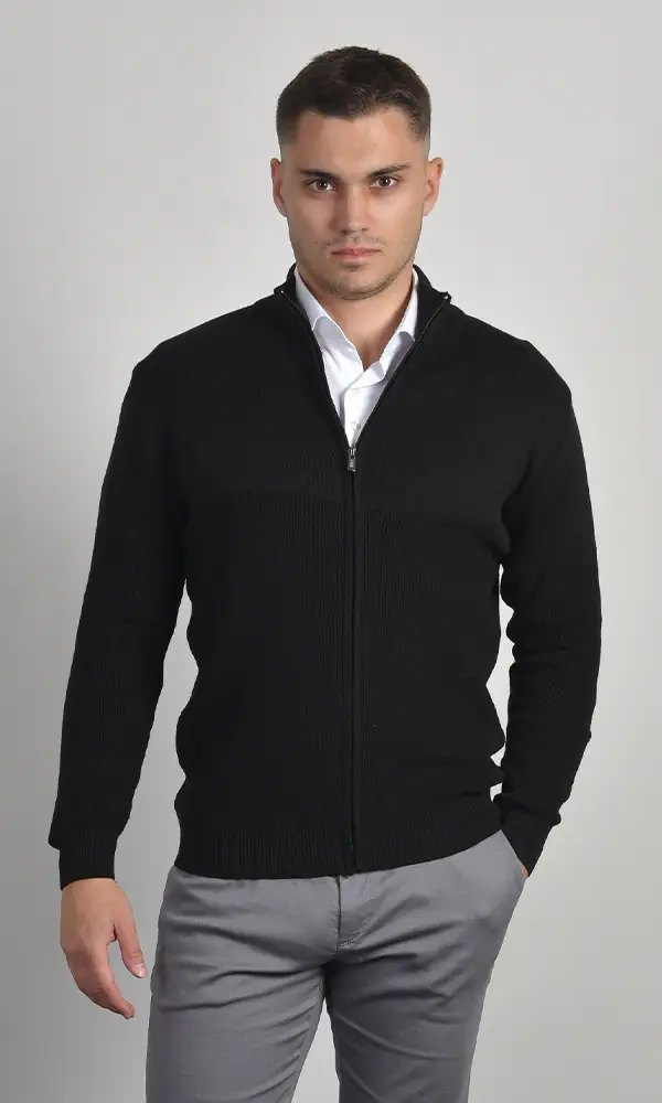 Muška džemper na puni zip u klasičnoj crnoj boji. Izrađena u rebrastom pletu, sa uspravnom kragnom i ranflama. Esencijalni komad za slojevito oblačenje koji pruža toplinu i strukturu, deo sofisticirane Atrium Fashion ponude.