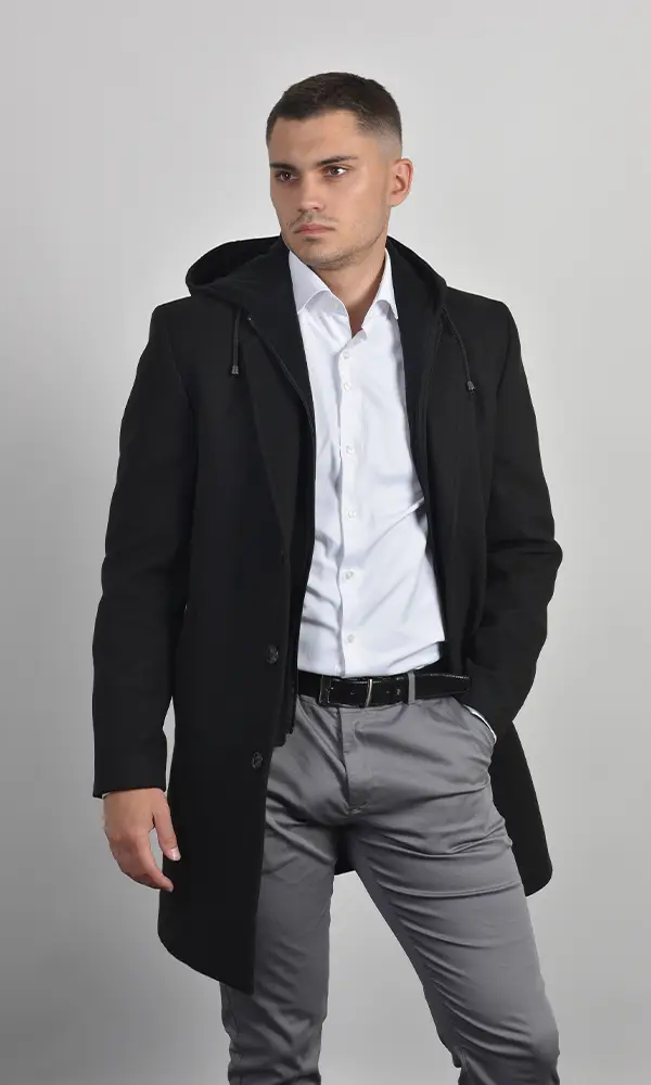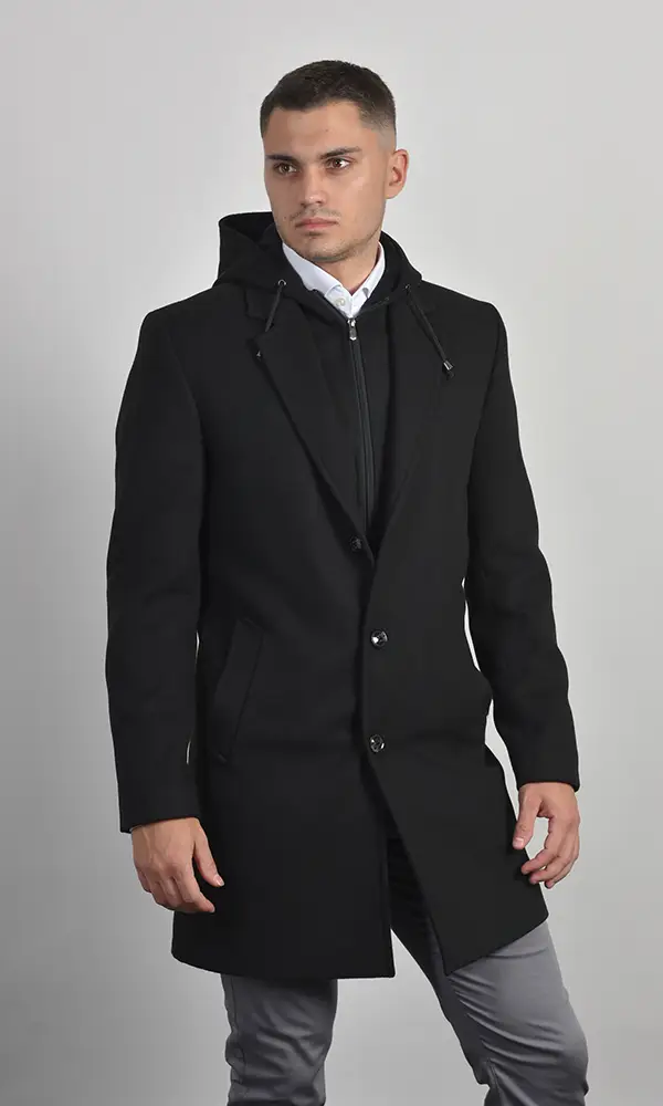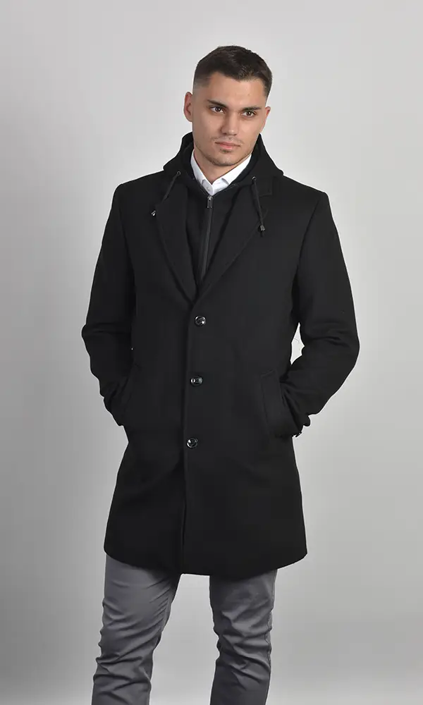 Muški kratki kaput u crnoj boji sa uklonjivim unutrašnjim umetkom na zip i kapuljačom. Izrađen od vunene mešavine sa klasičnom rever-kragnom. Savršen spoj formalnosti kaputa i praktičnosti jakne, idealan za dinamičan Atrium Fashion stil.