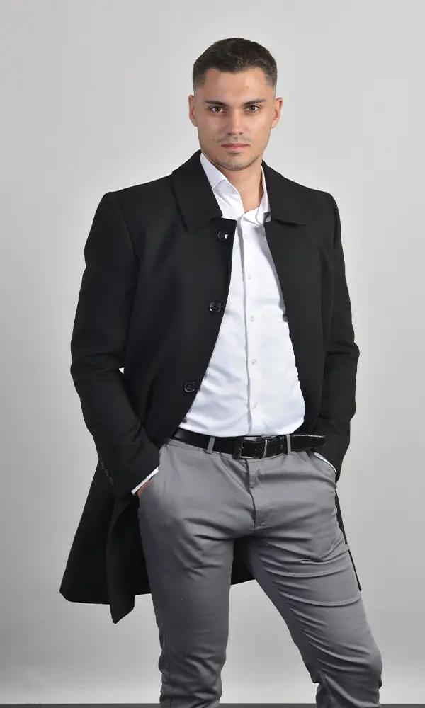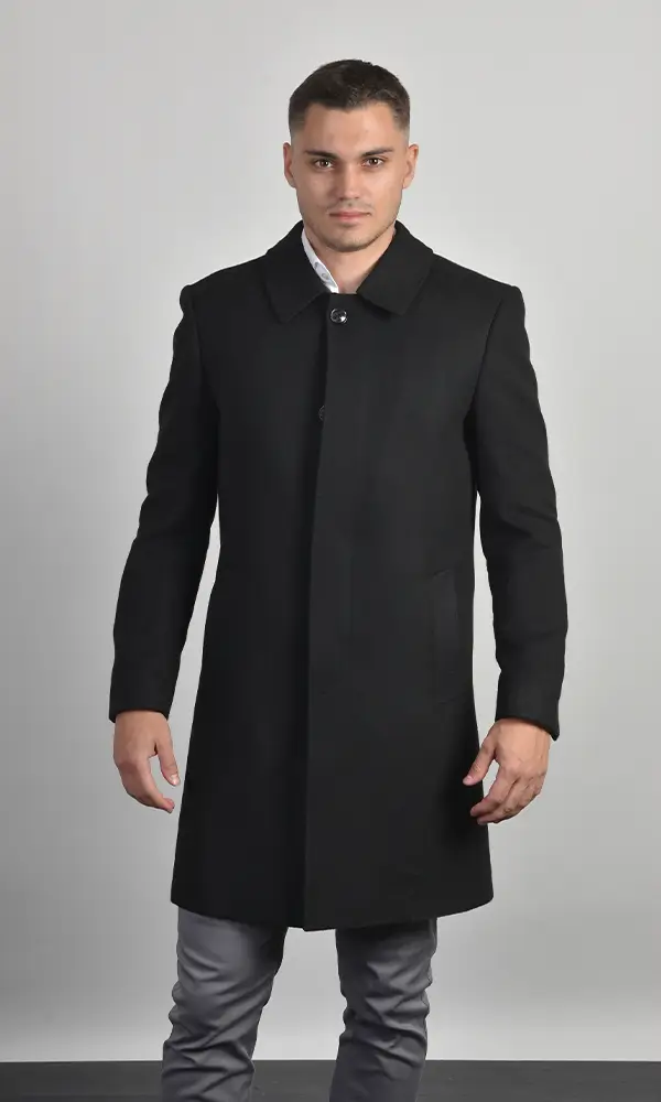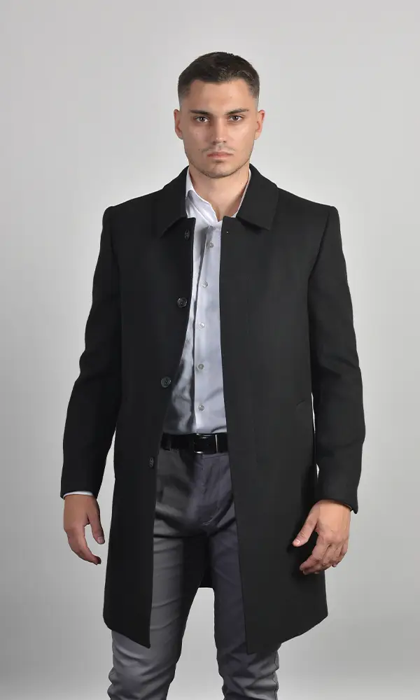 Ekskluzivan muški dugački kaput (maksi dužine) u elegantnoj crnoj boji, sa širokom rever-kragnom i diskretnim kopčanjem. Izrađen od premium vunene mešavine, pruža izuzetnu toplinu i dramatičan, sofisticiran izgled, u skladu sa visokom estetikom Atrium Fashion.