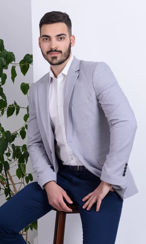 Ovaj Svetlo Sivi Karirani Sako iz kolekcije ATRIUM FASHION donosi čistu, prozračnu eleganciju, idealnu za letnje i prolećne smart-casual kombinacije. Njegov sitni karirani dezen (micro-check) daje sofisticiranu teksturu, dok svetla boja osigurava prefinjen izgled.
